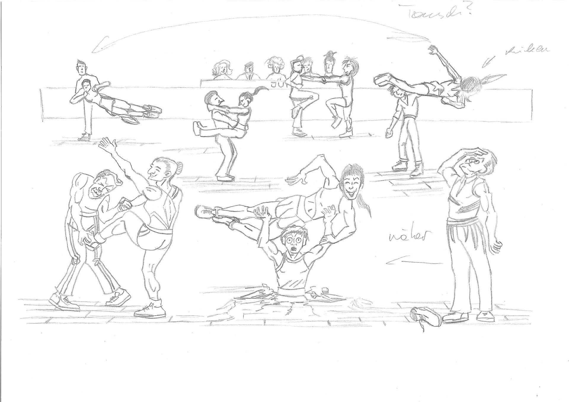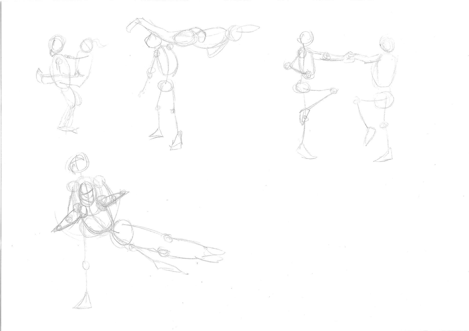 Nach der Ideenfindung wird Referenzmaterial gesammelt und nach diesem einzelne Tanzfiguren als Gesten mit Bleistift skizziert.